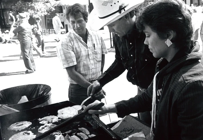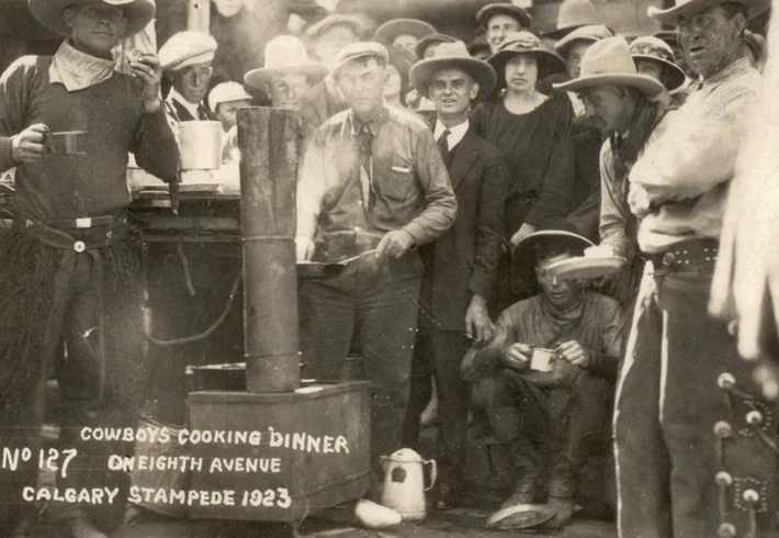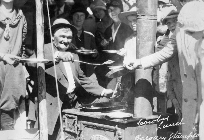 The Calgary Stampede’s pancake breakfast traces its roots to the early nineteenth century. The first pancake breakfasts were held in 1923 along Eighth Avenue and at the Old-Timers’ hut, a replica pioneer shack. Early pancake breakfasts were linked to the chuckwagon crews who served them and were associated with Alberta’s western image.